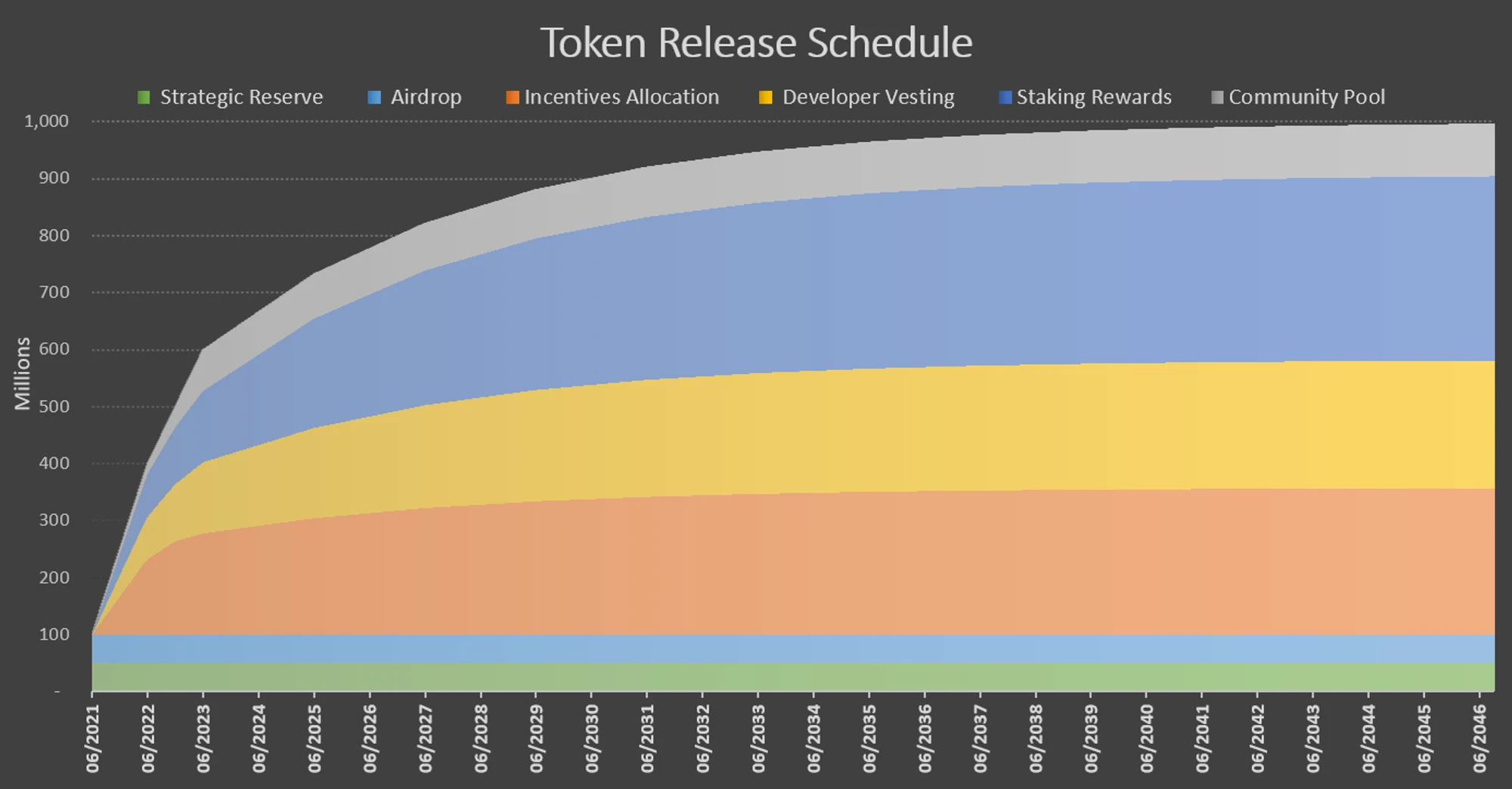 下图是 OSMO 代币的释放时间表,最初流通量为 1 亿枚,即空投 5000 万枚以及战略储备 5000 万枚。剩下 9 亿枚代币按第一年 3 亿枚,往后每年减产 1/3 的速度分配给 OSMO 质押激励、开发者、流动性激励、社区国库,直至释放完。