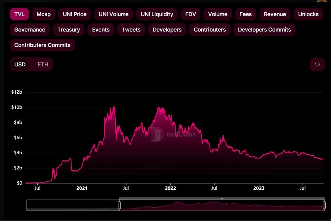 Uniswap 从 100 亿美元下降至 32 亿美元,跌幅约 68% :