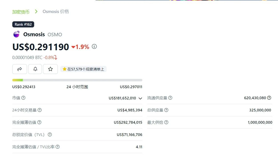 根据 Coingecko 的数据,当前 OSMO 代币价格为 0.29 美元,达到了历史最低的价格,且仍处于持续下跌中。流通市值约 1.8 亿美元,FDV 约 2.9 亿美元。