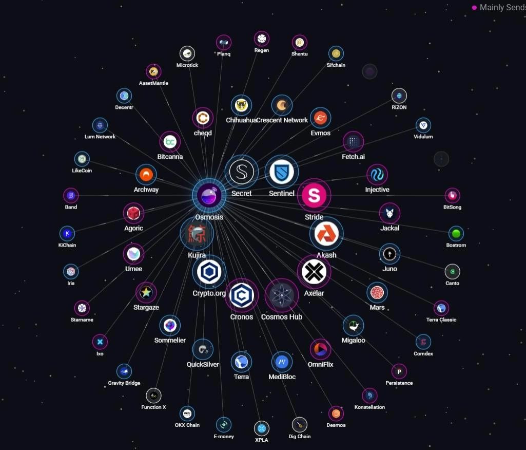 根据 MapOfZones 数据,当前通过 IBC 连接至 Cosmos 生态的链一共 62 条,其中与 Osmosis 相连的链数量最多,达到了 59 条: