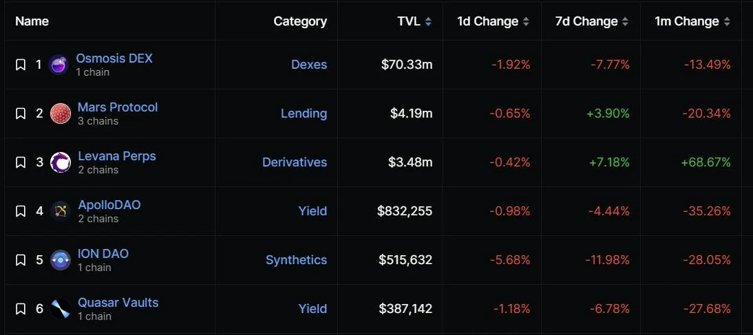 例如 Mars Protocol 为主要的借贷协议、Levana Perps 永续合约平台,以及 Quasar 是围绕 DEX 的收益协议等。