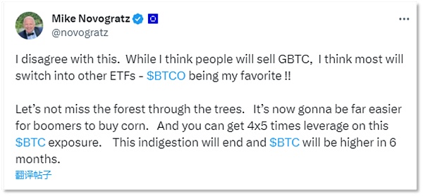 1月 21 日,美国加密金融服务公司Galaxy Digital Holdings的创始人迈克尔·诺沃格拉茨(Michael Novogratz)在社交媒体发文称,虽然投资者会出售 GBTC,但大多数人会转向其他 ETF。他并不担心当前的波动,并预测市场“消化不良”的状态会在六个月内结束,BTC也将迎来新高。