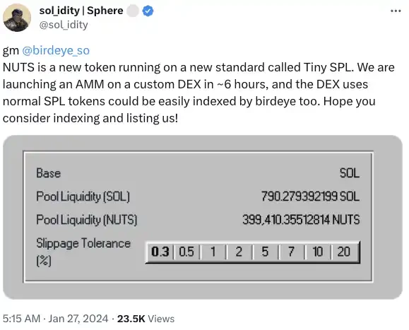 Deez Nuts 的「重生」离不开 Tiny SPL 的创始人 sol_idity 的努力,推出 Deez Nuts 后,创始人一边开发批量合成和 AMM 交易功能,一边不断呼吁 Solana 上的 DEX 聚合器 birdeye 为 DN 添加索引。得益于创始人和社区共同努力, 1 月 20 日 Deez Nuts 在官推上呼吁筹款后的 24 小时内,就完成了 800 SOL / 400, 000 NUTS 的筹款目标。