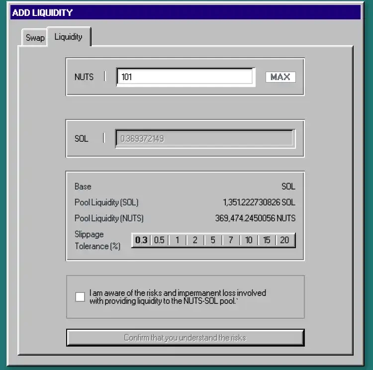 除了交易,用户还可以将持有的 NUTS 加入到 AMM 池中作为 LP,截至目前已经有超 1300 多个 SOL 被添加到 AMM 池中。贡献者将在 LP 池中锁定 1 个月,之后所得 LP 代币将按比例返还给贡献者。初始 LP 贡献者将赚取代币锁定当月交易量的全部 1% 交易费。