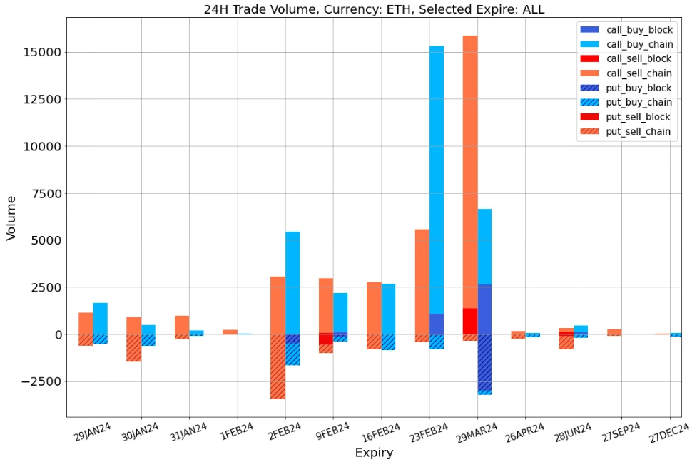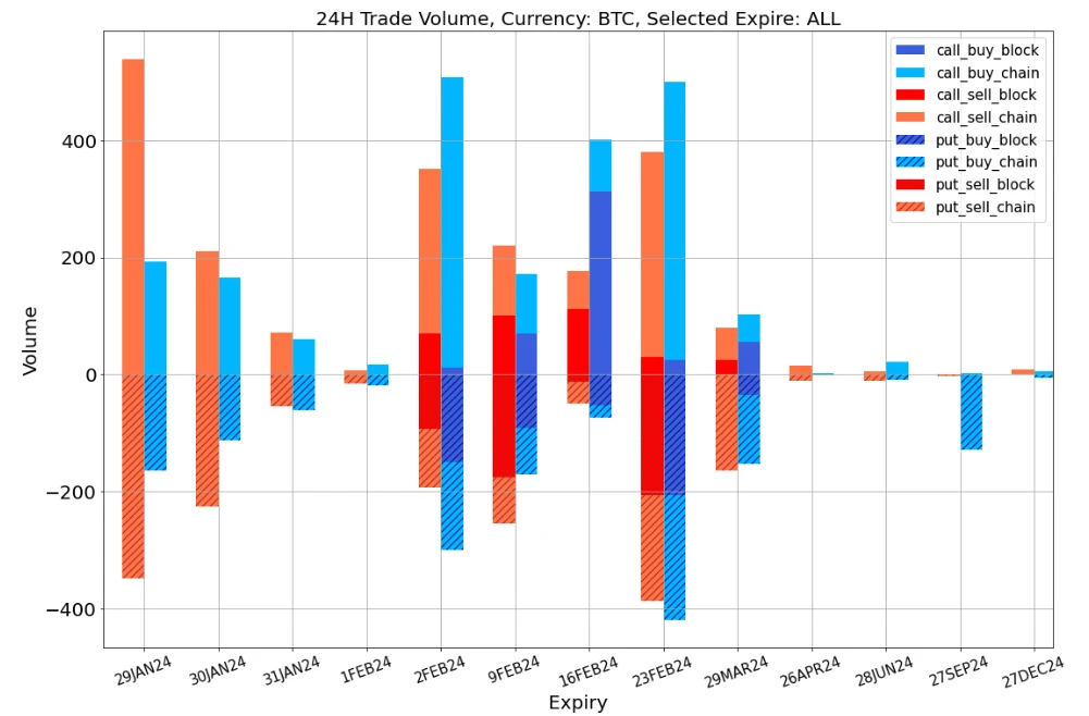 从交易上看,价格的反弹并未刺激交易量回归,过去 24 小时全市场整体交易量仅有 700 M 左右。BTC 成交分布较为均衡地分布在 23 FEB 及其之前的到期日上,并呈现出正向的 Risky Flow,同时也能观察到近期的 25 dRR 从负值回归到 0 值附近。ETH 成交集中在 option chain 上 Buy 24 FEB 2400-C vs Sell 29 MAR 2700-C 组成的三角价差策略,单腿成交额超过 13000 ETH。