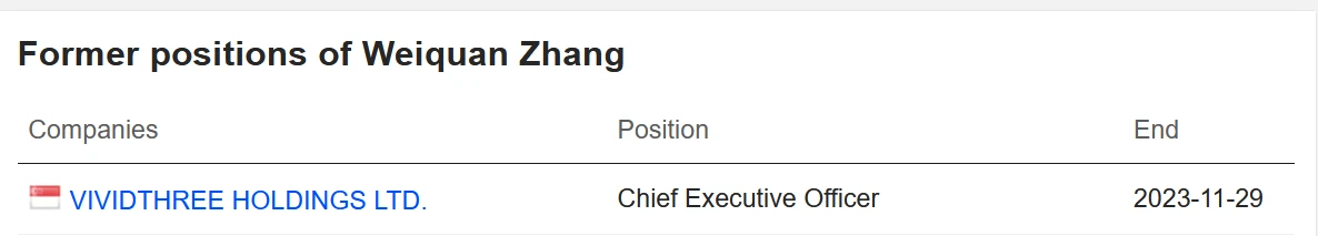 在获得 Vividthree 投资后,Zhang 于 2022 年 5 月 31 日起担任了该公司(副)CEO,并于 2023 年 11 月 29 日离任,原因不详。