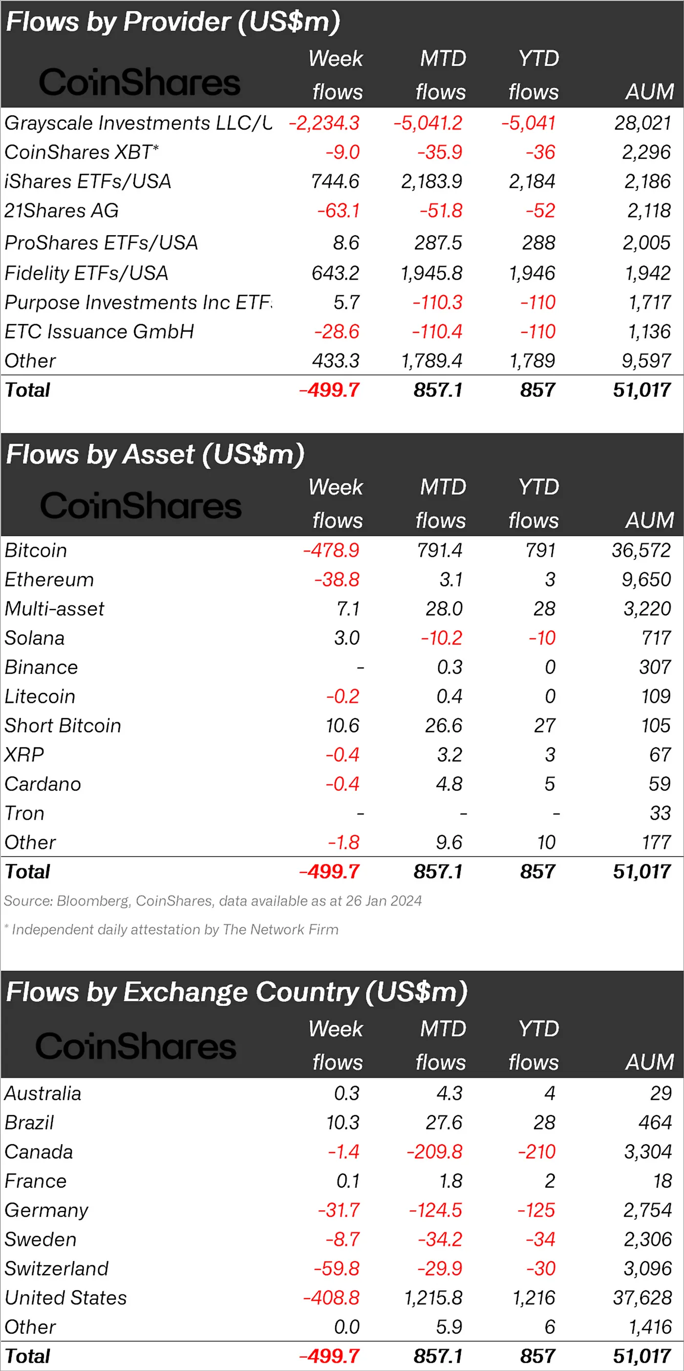 博链财经BroadChain获悉,1月29日,CoinShares 最新周报显示,上周 数字资产 投资产品资金流出共计 5 亿美元。