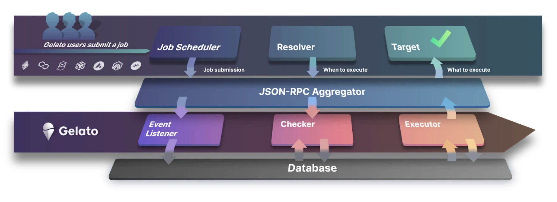 Gelato 的网络架构中有三个角色,分别是 Event Listener, Checker 和 Executor。Listener 负责监听链上事件,当发现触发条件达成后,将用户逻辑提交给 Checker,Checker 根据逻辑来检查自动化任务在给定时刻是否可以执行,当认为触发条件已经正确达成时,将交易提交给 Executor,Executor 为基础设施运营商网络,负责最终执行链上交易,也被称为 Bot 或 Keeper。