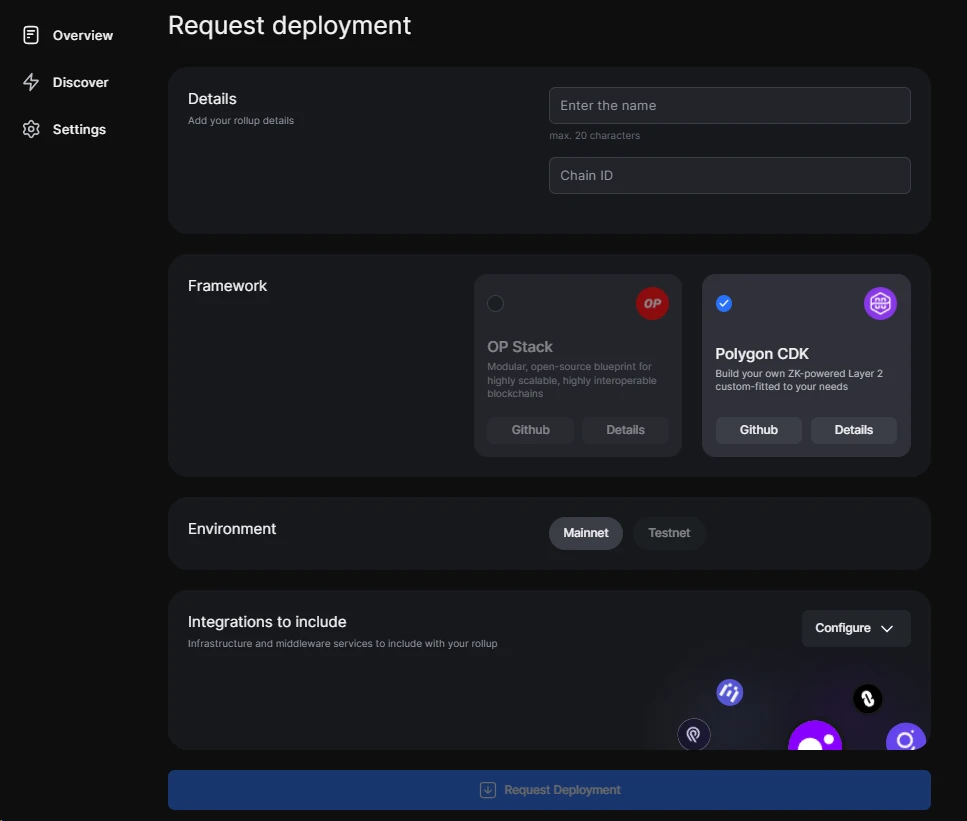 为降低开发难度,Gelato 于 2023 年 12 月份推出 Deployment Platform,开发者可以直接选择 Rollup 框架、数据可用性层和中间件集成,通过几次点击即可创建一个 Rollup。
