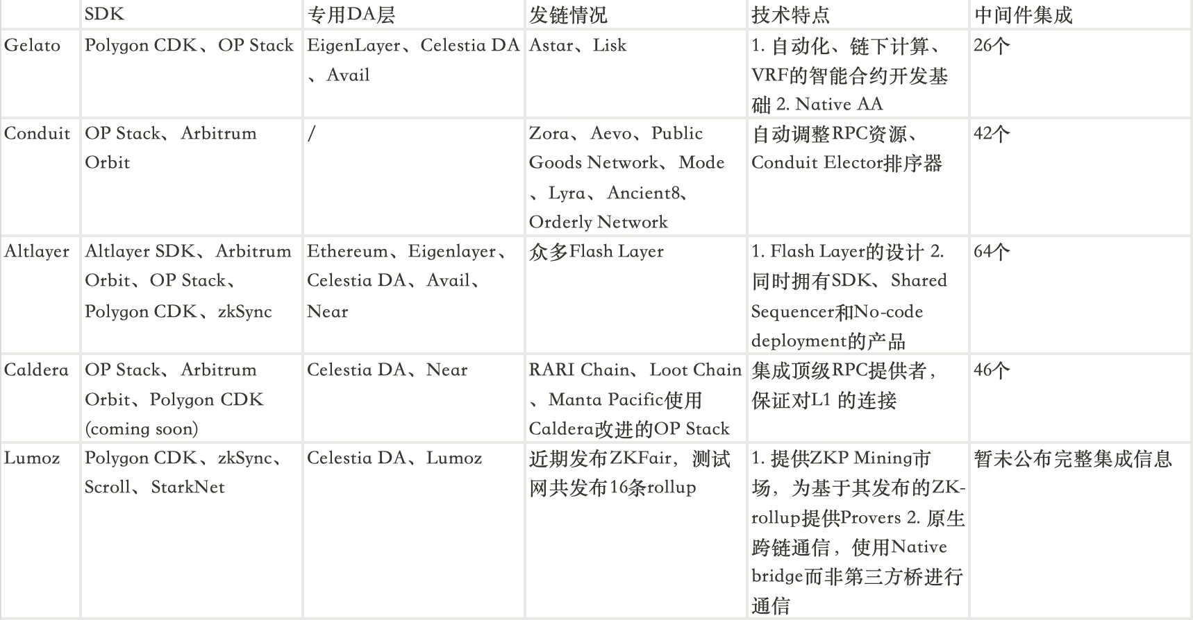 RaaS 赛道内同属 No-code Deployment 细分领域的项目包括 Conduit、Altlayer、Caldera、Lumoz,各项目的基本信息可见下表。