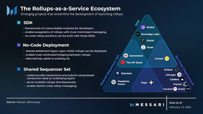 根据 Messari 的分类,RaaS 生态目前主要包含三类项目:SDK、Shared Sequencer Set 和 No-code Deployment。Gelato 所属的赛道为 No-code Deployment,通过集成 SDK 框架和基础设施服务,为开发者实现一站式服务。与 Gelato 同属于这一赛道的项目还包括 Lumoz、Altlayer、Caldera、Conduit 等。