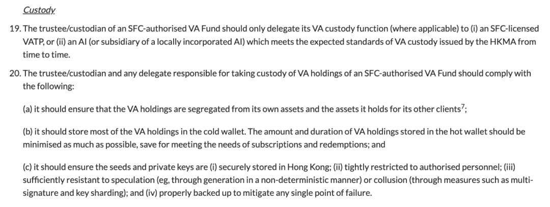 与期货 ETF 的托管要求只涉及现金有所不同,现货 ETF 的托管难点是托管机构需要负责比特币托管。目前,根据 SFC 的《有关证监会认可基金投资虚拟资产的通函》,SFC 授权的虚拟资产基金的受托人 / 托管人只能将虚拟资产托管职能委托给持有 SFC 牌照的虚拟资产服务提供商(VATP)或符合 HKMA 发布的虚拟资产托管标准的金融机构或本地子公司。