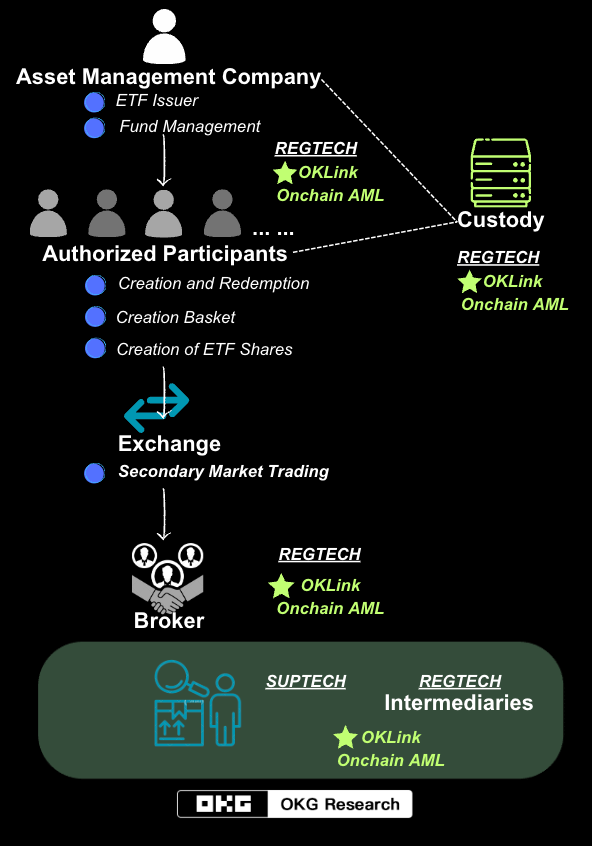 图 以 OKLink Onchain AML 为例,比特币现货 ETF 从发行到交易合规科技助力简易图。注:此为粗略流程图;在合规科技的要求上,「中介人」(Intermediaries)均需合规科技加持是一种更为严谨的做法。