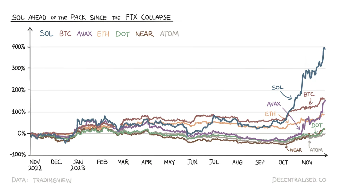 SOL 价格在几周内从 236 美元暴跌至 13 美元。投资机构建议初创公司不要选择 Solana,转而在以太坊虚拟机(EVM)上构建。随后,一些知名项目从 Solana 迁移到其他链上。然而,一年后,正如下图所示,Solana 反弹,超越了同行。