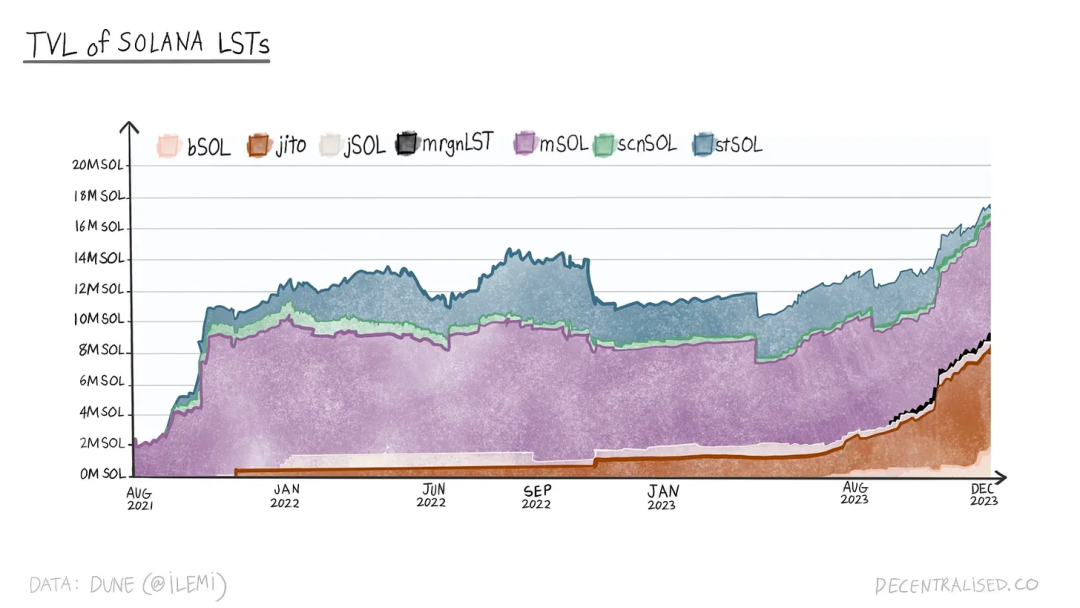 其中,有惊人的 3.62 亿或约 95% 是本地质押,意味着被锁定并且没有利用任何质押衍生品。这意味着通过本地 SOL 进行质押的用户错失了将流动型Token用于 DeFi 的机会。若通过像 Marinade 或 Jito 这样的协议进行 SOL 质押,您将获得 mSOL 或 JitoSOL 作为回报,可在 DeFi 应用中使用。随着质押衍生品的发展,人们可以预期用户逐渐选择衍生品,而不是承担机会成本。