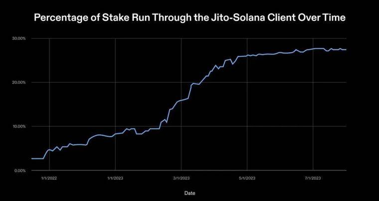 一段时间内通过 Jito-Solana 客户端运行的质押百分比