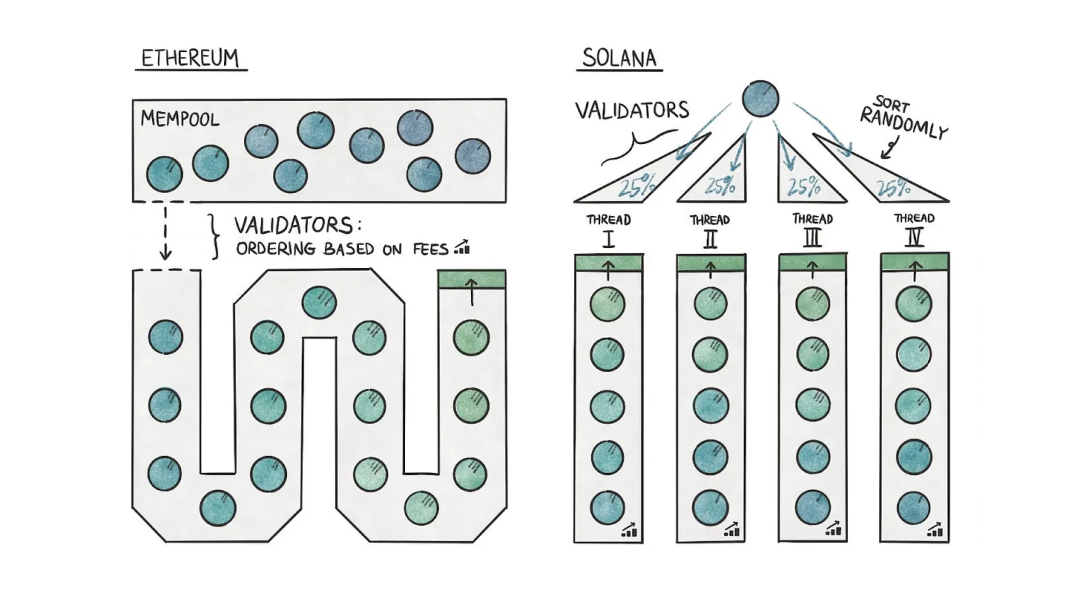 与以太坊不同,Solana 是多线程的,可以并行执行交易。 当签名交易到达领导者时,领导者验证它们,并将它们随机分配到线程中。 只有当分配到领导者本地不同线程时,它们才按优先级费用(即手续费最高的交易优先)排序。