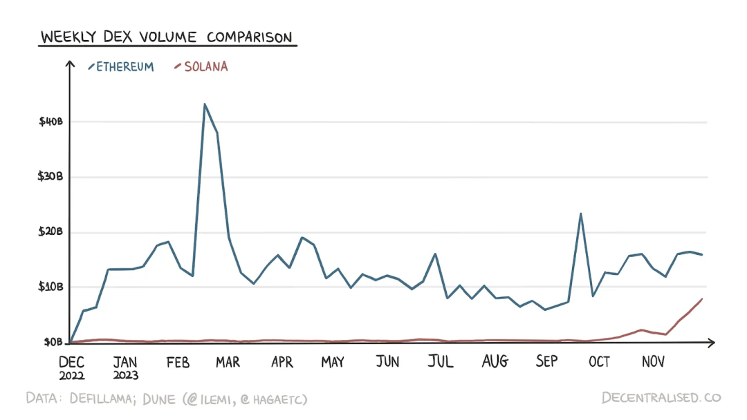 周度以太坊和 Solana 的交易量比较