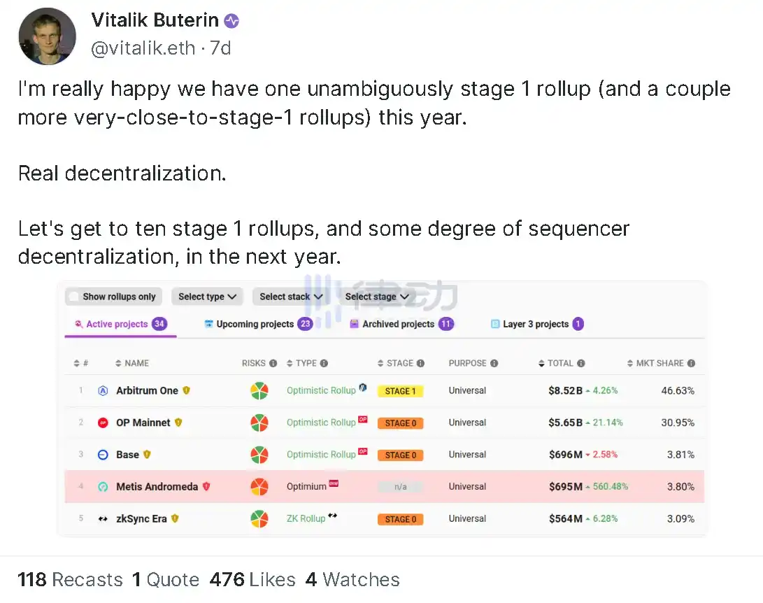 Arbitrum 去年底获得了 Vitalik 的 良好评价,「这是真正的去中心化进步,希望明年可以看到十个 Rollup 进入第一阶段,并实现一定程度的定序器去中心化。」评论发布几小时后,ARB 价格上涨了 22% 。