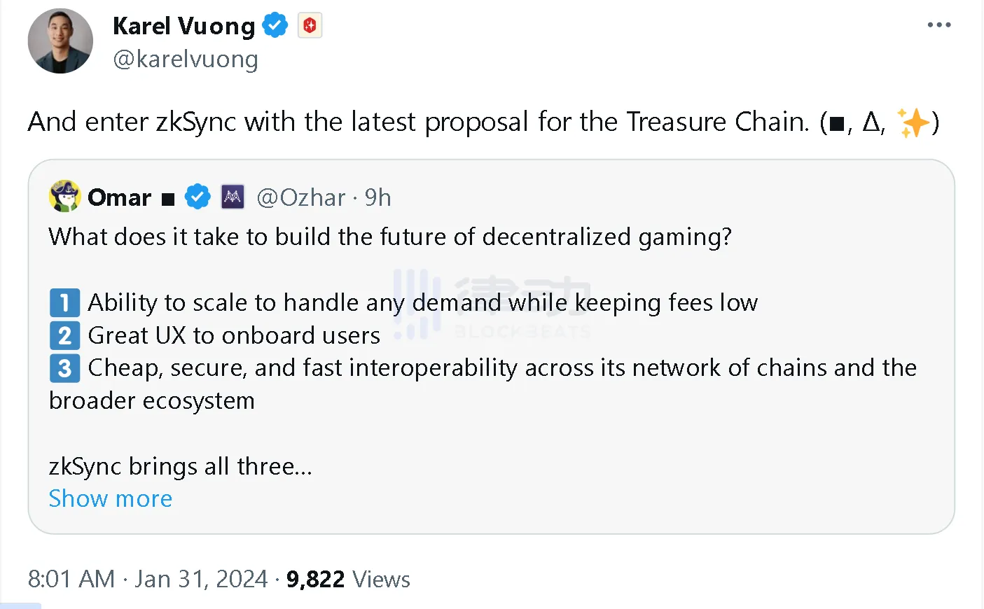 昨日,Optimism 联合创始人兼首席科学家 Ben Jones 提议 Treasure 加入 Optimism Superchain 并基于 OP Stack 构建 Treasure Chain。紧接着,zkSync 开发商 Matter Labs BD 负责人 Omar 今日在 TreasureDAO 社区发表提议,希望 Treasure Chain 使用 ZK Stack 作为 Layer 2 。