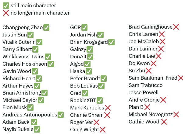 八个月后,我看到加密世界经历了一场截然不同的动荡:Sam Bankman-Fried 和 FTX 的公开消亡。当时,有人在 Twitter 上发布了一长串“加密主角”,显示哪些已经倒下,哪些仍然完好无损。这份名单的伤亡率很高: