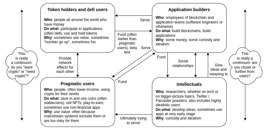 四个群体各自拥有复杂的动机,并且这些动机以各种复杂的方式与其他群体相互作用。也存在每个群体的“功能失调”版本:应用可能是剥削性的,DeFi 用户可能无意中加强了剥削性应用的网络效应,实用主义用户可能加深了对中心化工作流程的依赖,知识分子可能过于沉迷于理论,专注于通过指责人们“不一致”来试图解决所有问题,而没有认识到金融激励(和“用户不便”的去激励因素)也很重要,这些都可以且应当被解决。