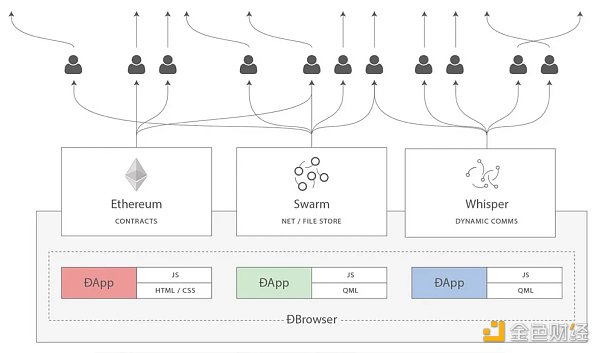 以太坊的图表和两个提议的非区块链姊妹协议 Whisper 和 Swarm,Gavin Wood 在他的许多早期演讲中都使用了它们