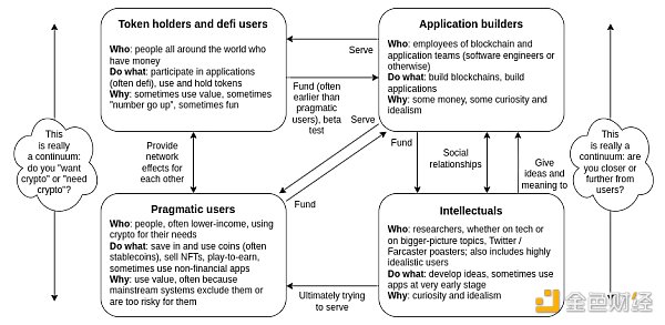 四个群体各自拥有复杂的动机,并且这些动机以各种复杂的方式与其他群体相互作用。也存在每个群体的“功能失调”版本:应用可能是剥削性的,DeFi 用户可能无意中加强了剥削性应用的网络效应,实用主义用户可能加深了对中心化工作流程的依赖,知识分子可能过于沉迷于理论,专注于通过指责人们“不一致”来试图解决所有问题,而没有认识到金融激励(和“用户不便”的去激励因素)也很重要,这些都可以且应当被解决。