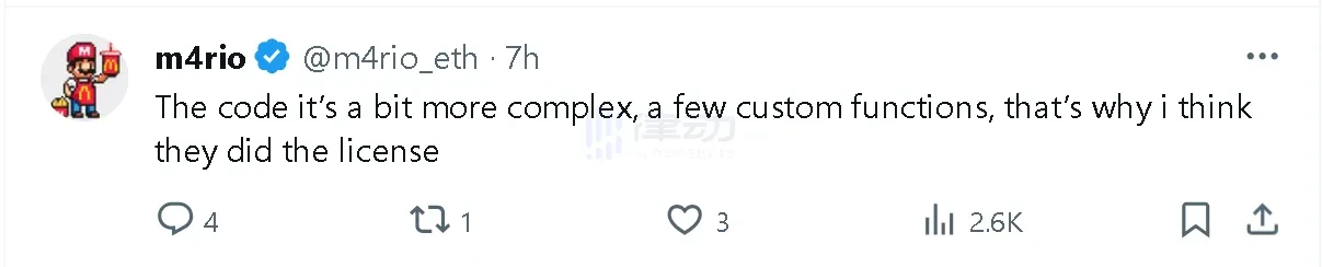其中,EthernautDAO 建设者 @m 4 rio_eth 也表示,「代码有点复杂,有一些自定义函数,这就是为什么我认为他们做了许可证。」