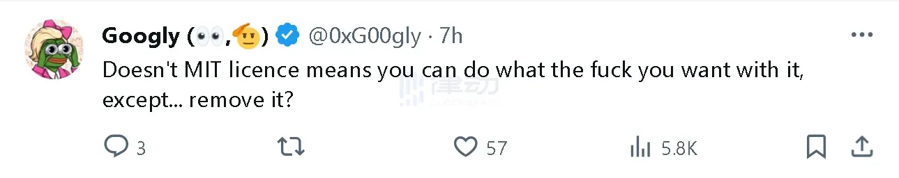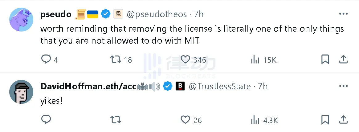 而 Scroll 的开发者 @pseudotheos 也解释到,「实际上,移除许可证是 MIT 唯一不允许做的事情」。甚至 Bankless 普通合伙人 @TrustlessState 也用一句简短的「yikes」表示感叹。