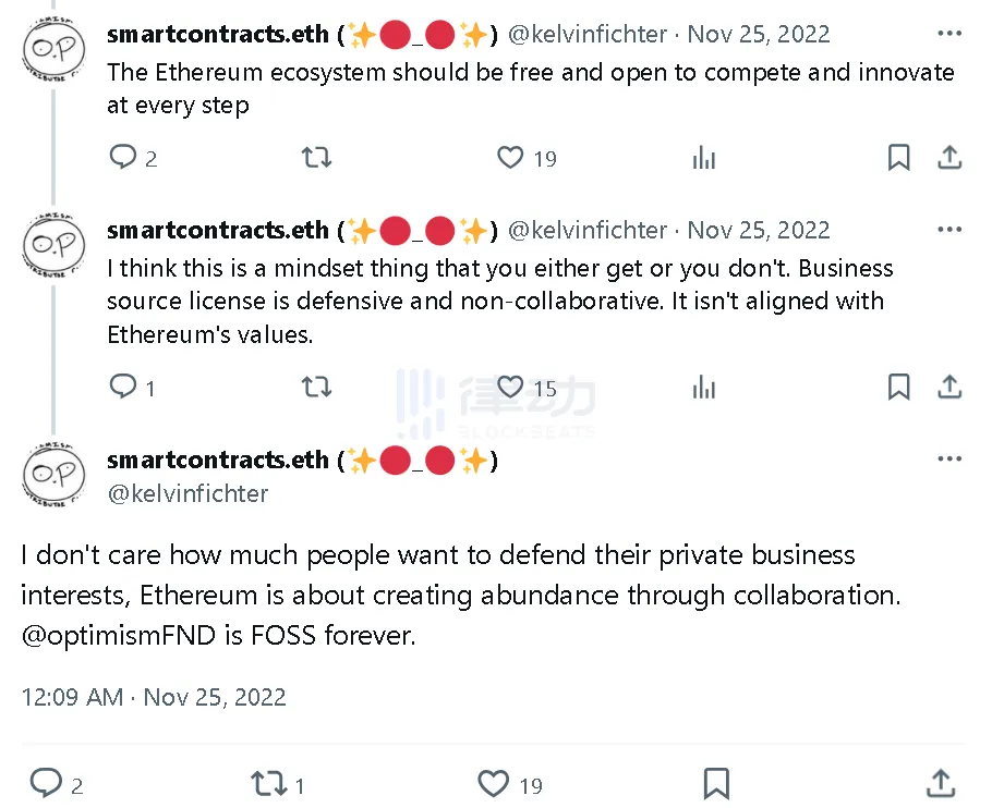 @kelvinfichter 认为,以太坊生态系统应该是自由和开放的,以便在每一步中竞争和创新。但商业源许可证是防御性的、非协作性的。它与以太坊的价值观不一致。「我认为这是一种心态,我不在乎有多少人想捍卫自己的私人商业利益,以太坊就是通过合作创造丰富。Optimism 永远是自由开源软件。」