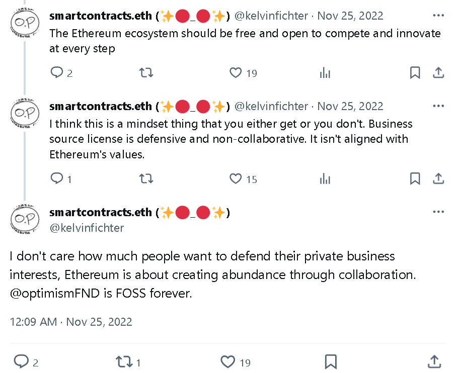 @kelvinfichter 认为,以太坊生态系统应该是自由和开放的,以便在每一步中竞争和创新。但商业源许可证是防御性的、非协作性的。它与以太坊的价值观不一致。「我认为这是一种心态,我不在乎有多少人想捍卫自己的私人商业利益,以太坊就是通过合作创造丰富。Optimism 永远是自由开源软件。」