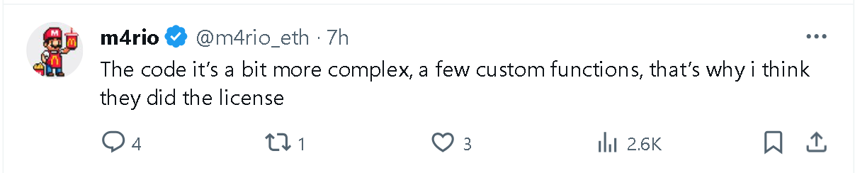 其中,EthernautDAO 建设者 @m4rio_eth 也表示,「代码有点复杂,有一些自定义函数,这就是为什么我认为他们做了许可证。」