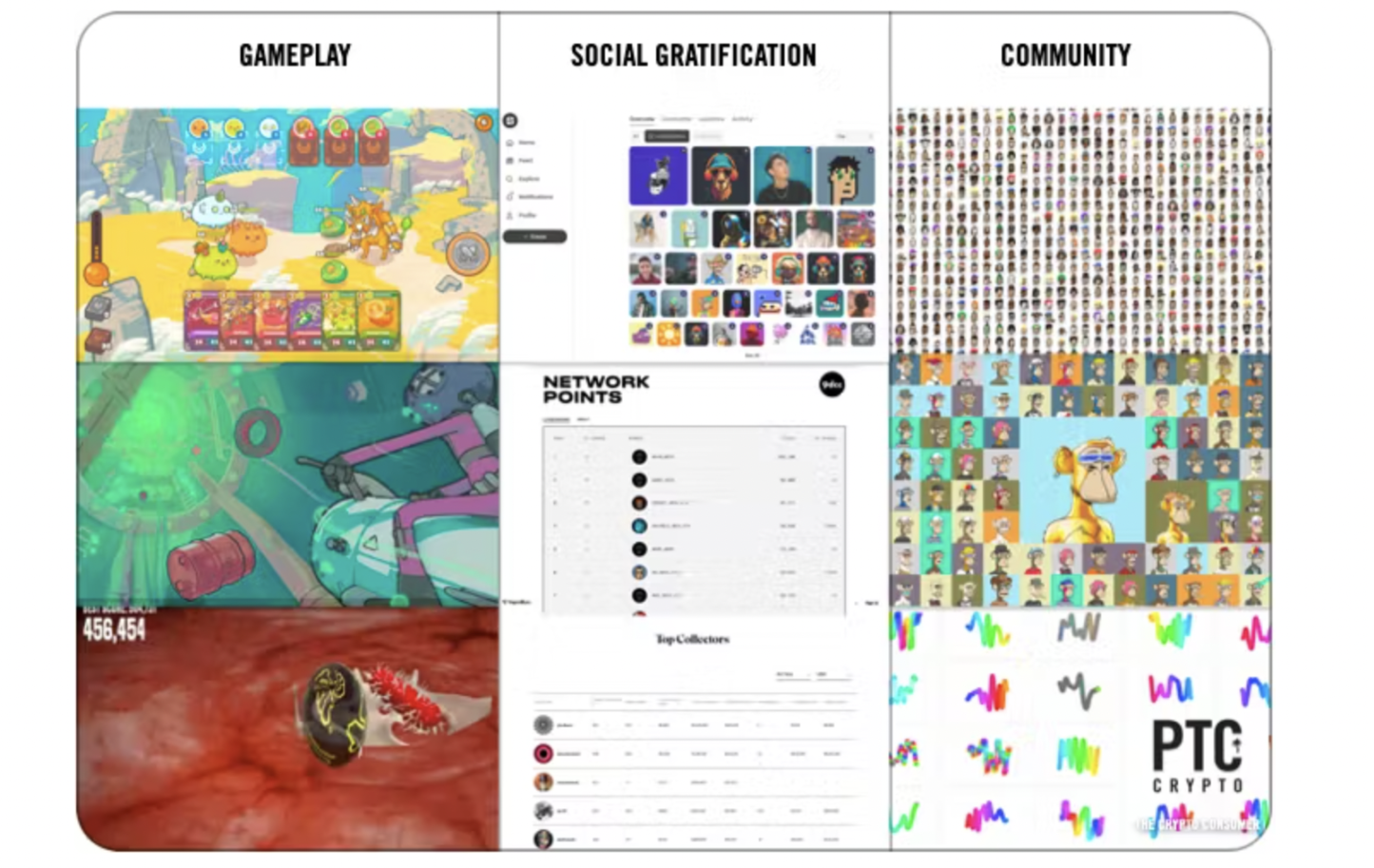 这个领域已经出现了许多游戏化的例子:Axie Infinity、Dookey Dash 和 The Worlds Largest 等游戏中的游戏玩法;媒体和娱乐应用程序中的社交满足感,例如 Sound、SuperRare 和 9 dcc 上的排行榜;通过一系列独特的 NFT(例如 Punks、Squiggles 和 Apes)来增强项目的社区意识。