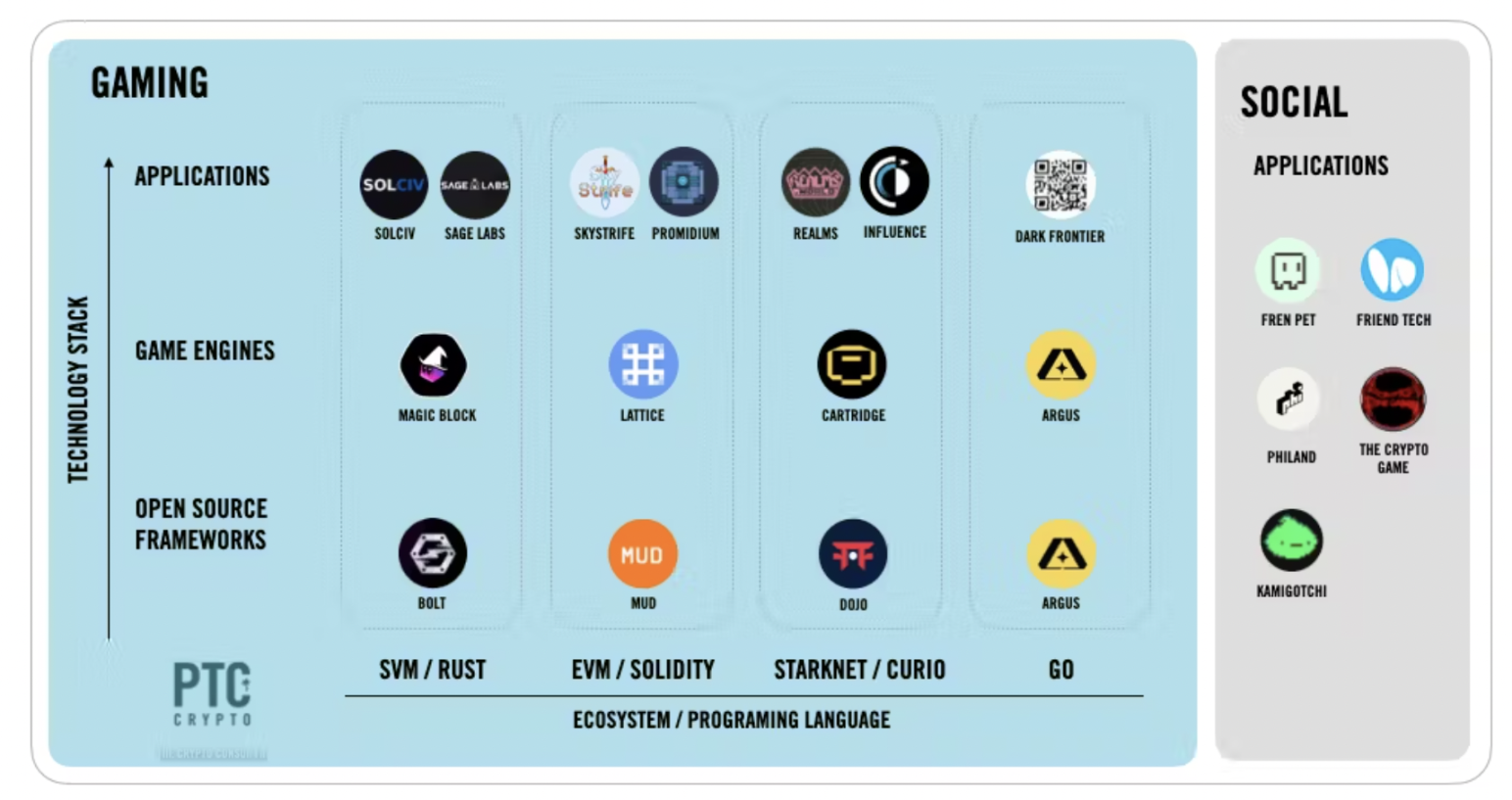 AW 空间仍然很小,但在多个生态系统中增长迅速,包括以太坊 VM (EVM)、Cairo VM (Starknet )、Solana VM (SVM) 等。每个生态系统都有开源框架,例如 Lattice 为 EVM 构建的 MUD、 Cartridge 和 Realms 为 Starknet 构建的 DoJo、 Magicblock 为 SVM 构建的 Bolt 等。每个生态系统都有许多构建在其之上的游戏,例如 MUD/EVM 上的 Primodium 和 Skystrife,DoJo/Starknet 上的 Realms 和 Dope Wars , Bolt/SVM 上的 SolCIV 和 Sage 等。即使在特定游戏内,也有多种衍生游戏。例如,Realms 生态系统有数十种衍生游戏。