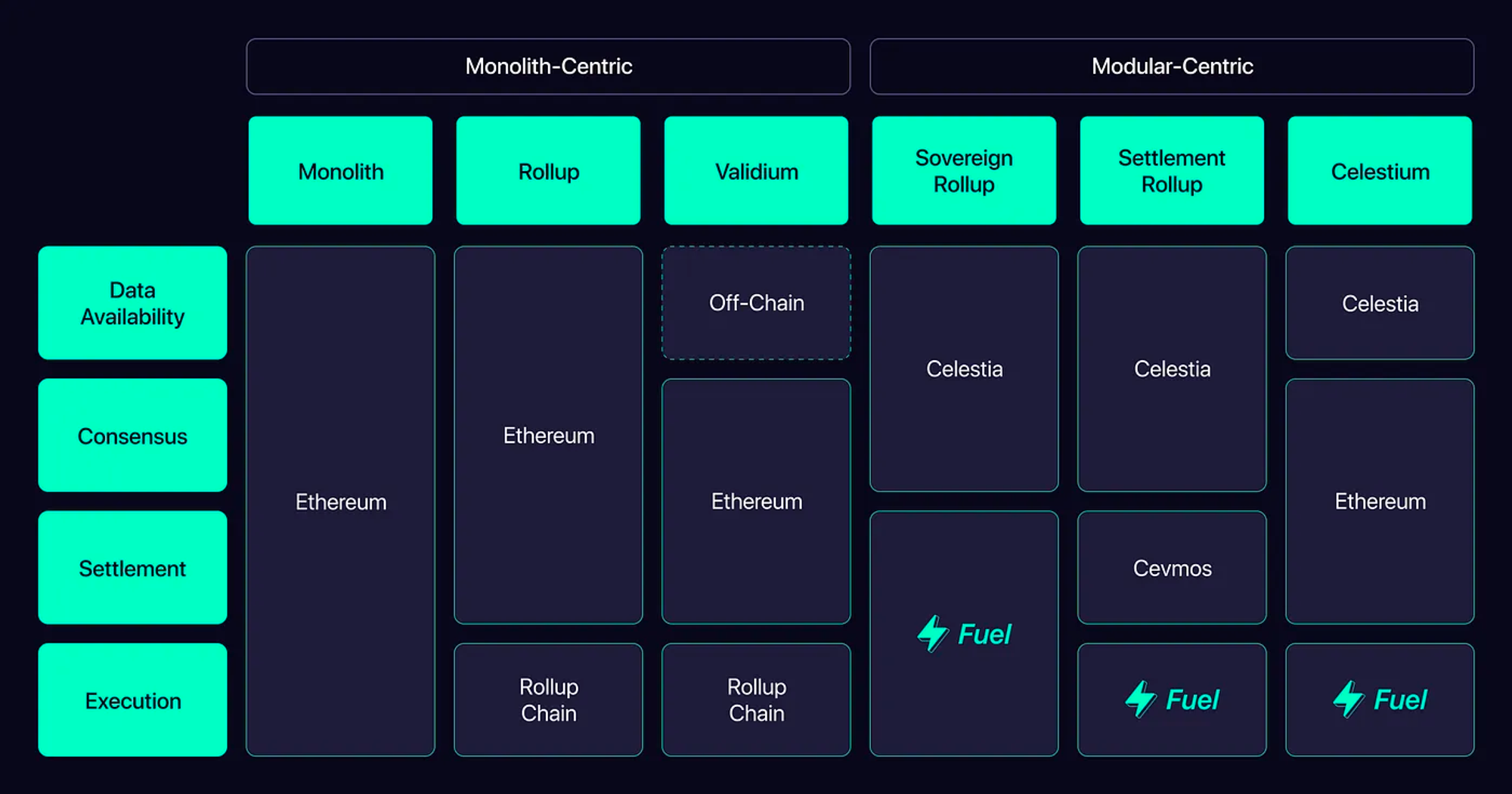 Fuel 与 Celestia虽相似,但有明显的不同点。Celestia 专注于数据可用性和共识的优化,处理数据排序,而 Fuel 则定位为模块化的执行层。