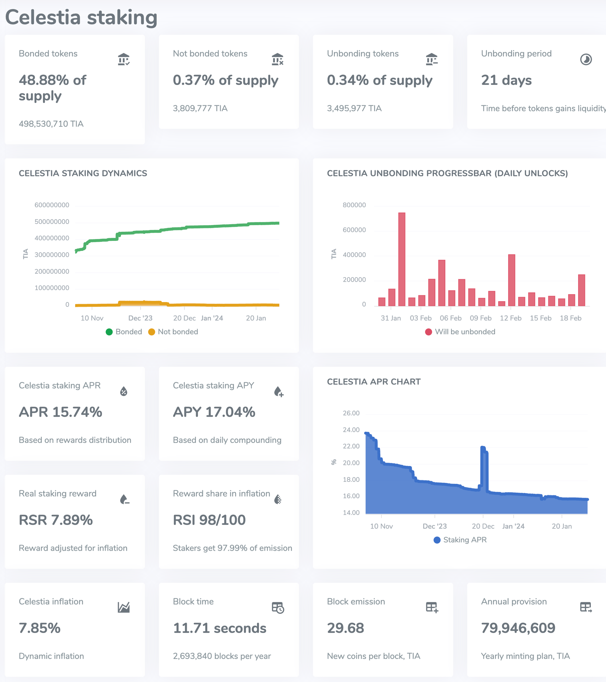 Celestia 目前的质押率为 48.88%,质押 APR 为 15.74%。
