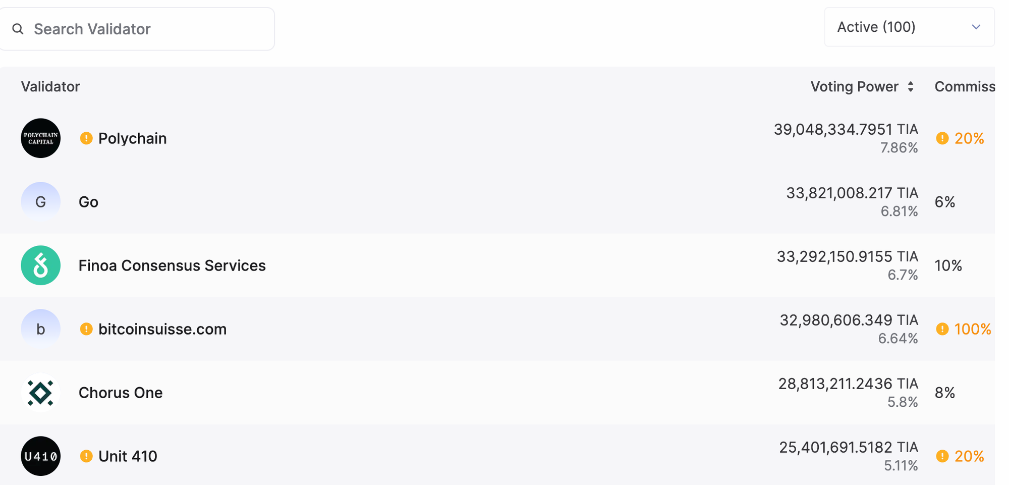 权益证明: Celestia 基于 Cosmos SDK 构建,使用权益证明来保障其共识。用户可以将 TIA 委托给验证者,并赚取一部分质押奖励。