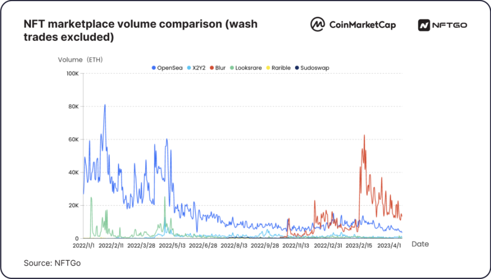 而 NFT 市场的格局也发生了巨变,Blur 从 2023 年初的与 Opensea 竞争激烈,到年底 Blur 几乎垄断了市场份额,而曾经独领风骚的 Opensea 在 2023 年 12 月份的周交易量仅占市场的 20% 。尽管 Opensea 做出了产品和社区反馈,试图抵御 Blur 的冲击,但效果甚微。随着 Blur 的崛起,零版税的争论也逐渐消失,关于「创作者是否应该获得版税」的讨论已经渐行渐远。