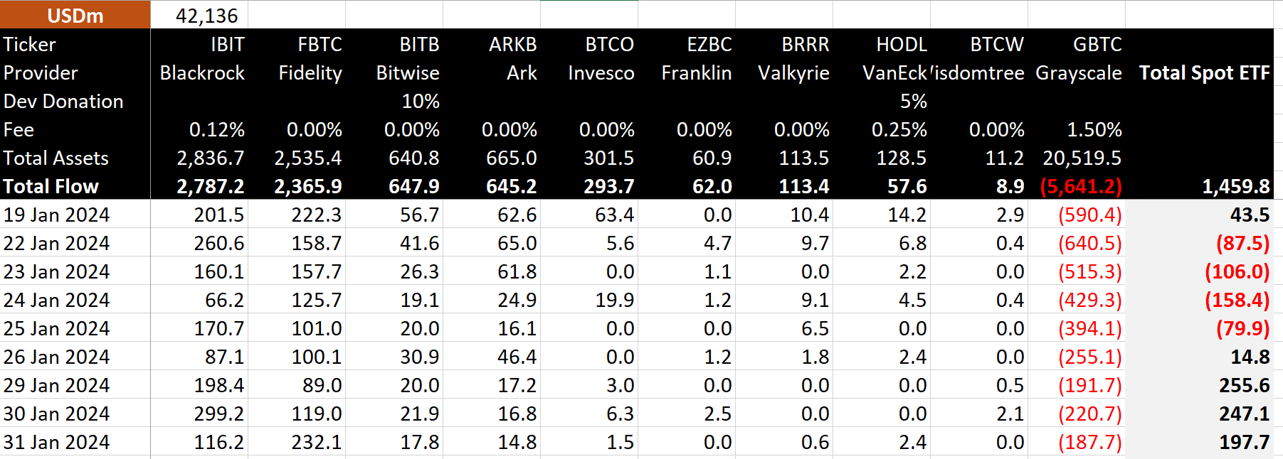 比特币现货ETF即时现况》灰度GBTC持仓跌破50万枚、总交易量达259亿镁、7家发行商0费率抢市