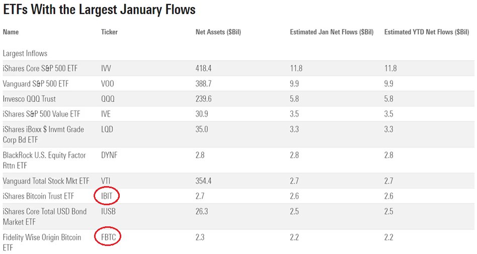 博链财经BroadChain获悉,2月3日,ETFStore 总裁 Nate Geraci表示, Morningstar 数据显示,贝莱德 比特币 现货 ETF iShares Bitcoin Trust ETF(IBIT)与 富达Fidelity Wise Origin Bitcoin ETF(FBTC)跻身 1 月 ETF 资金流入额前十名。