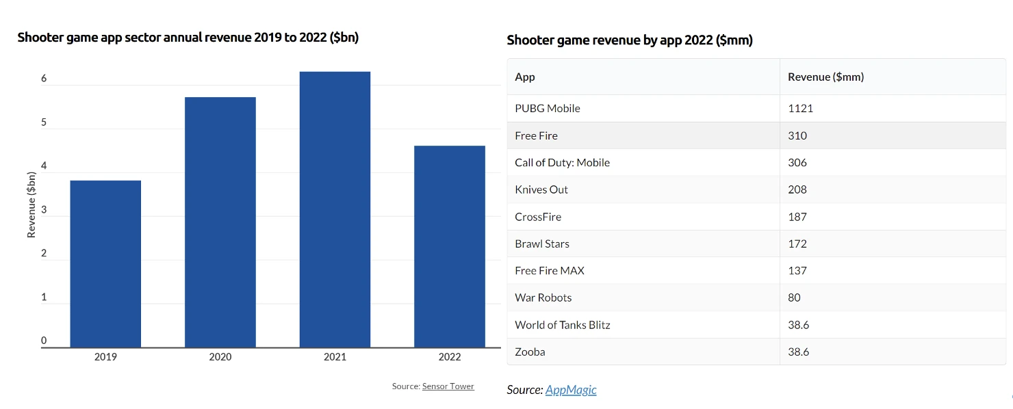 这是个多大的商业机会?我们先从Matr1x的首款游戏Matr1x Fire 对标的产品 Cross Fire 来做个市场预估:Cross Fire 的年市场营收 1.87 亿美金,我们保守估计Matr1x Fire 将能够通过Web3化的商业模式将其 ARPU 提升 30 倍(参考 CSGO 和 Cross Fire 的 100 倍 ARPU 差异),其年营收将有望达成 56.1 亿美金。而 56.1 亿美金是 2022 年最赚钱射击手游 PUBG Mobile 营收的 5 倍。这仅仅是计算了Matr1x Fire 的预计营收,目前Matr1x也即将推出包括大逃杀玩法在内的一系列Web3射击手游,如果我们按照同样的测算方法来计算Matr1x在射击手游领域能够达到的市场营收将有望达到 11.2 亿(PUBG mobile revenue)* 30 + 56.1 亿= 392.1 亿美金的市场规模,几乎相当于整个射击类手游的总体营收。而其用户规模将达到数百万级,为区块链带来前所未见的杀手级应用。
