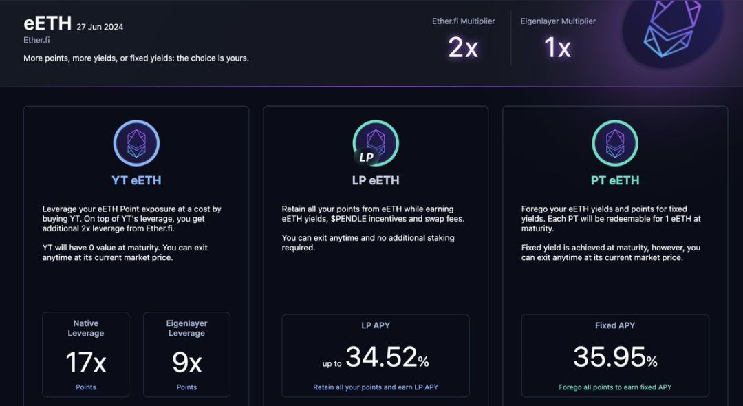 Pendle 推出了 LRT 专属页面 。可以看出每 1 YT eETH 代表可以获取 17 eETH 的 EtherFi 积分以及 9 eETH 的 Eigenlayer 积分,PT 固定利率为 36% 。