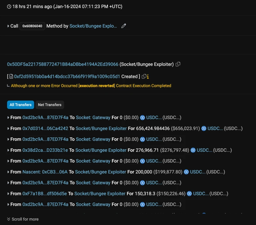 2024 年 1 月 16 日,Socket Tech 遭到攻击,损失约 330 万美元。攻击者利用了 Socket 某合约中数据验证环节的漏洞,通过恶意数据输入盗取了授权合约的用户资金。这次攻击共给 230 个地址带来损失,最大的单地址损失约为 65.6 万美元。