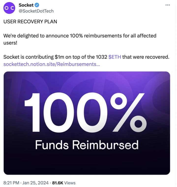 7.1 月 23 日,Socket 宣布已经追回 1032 枚 ETH,并在 25 日宣布将全额补偿所有损失。本次事件得到解决。