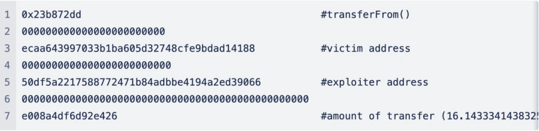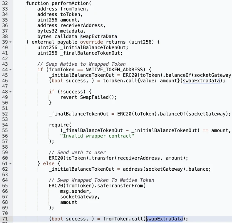在这次事件中,攻击者制作了一个恶意的 swapExtraData 输入,触发 transferFrom 函数。该恶意调用利用了用户对 SocketGateway 合约的授权,从他们那里盗走了资金。