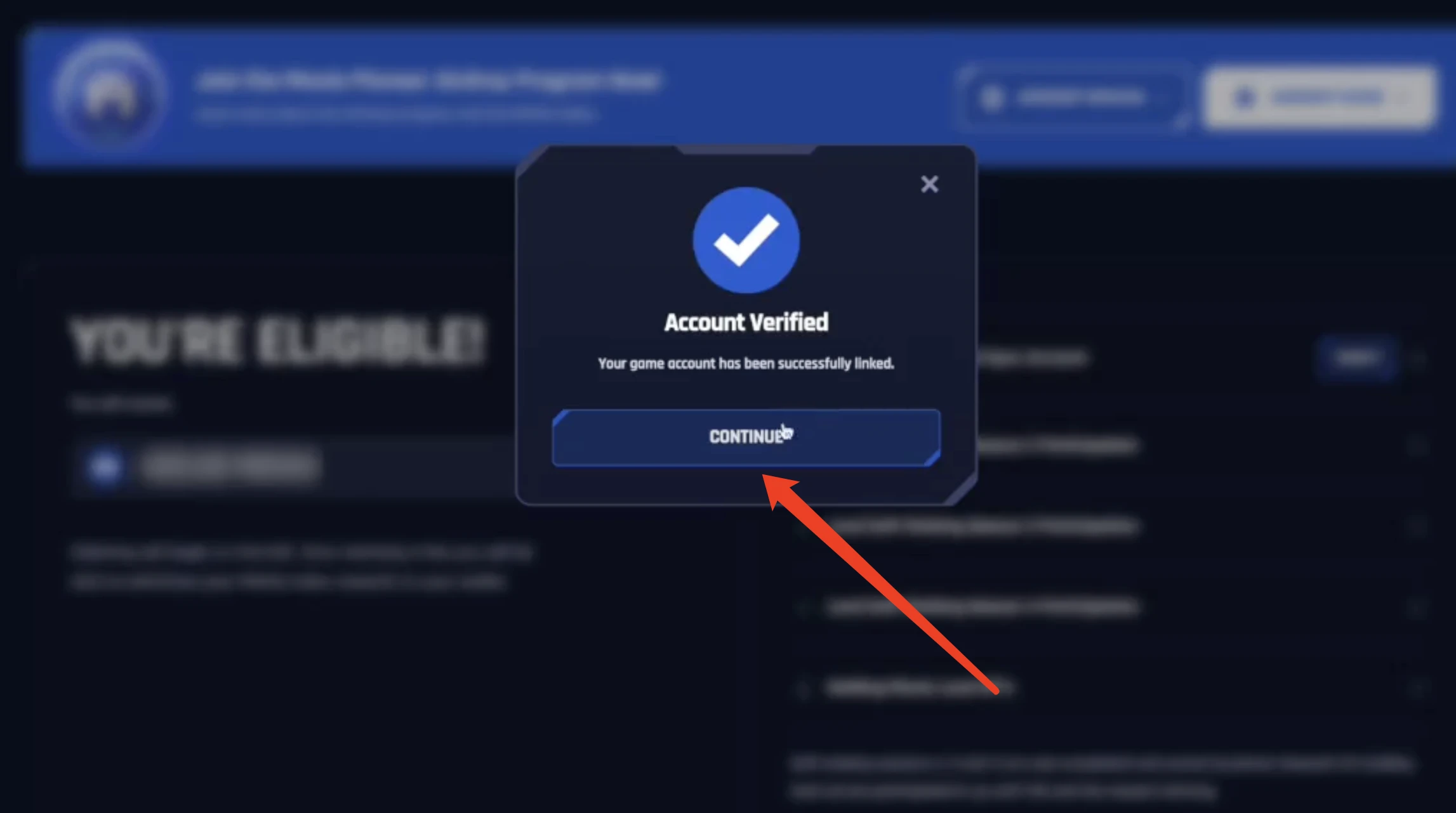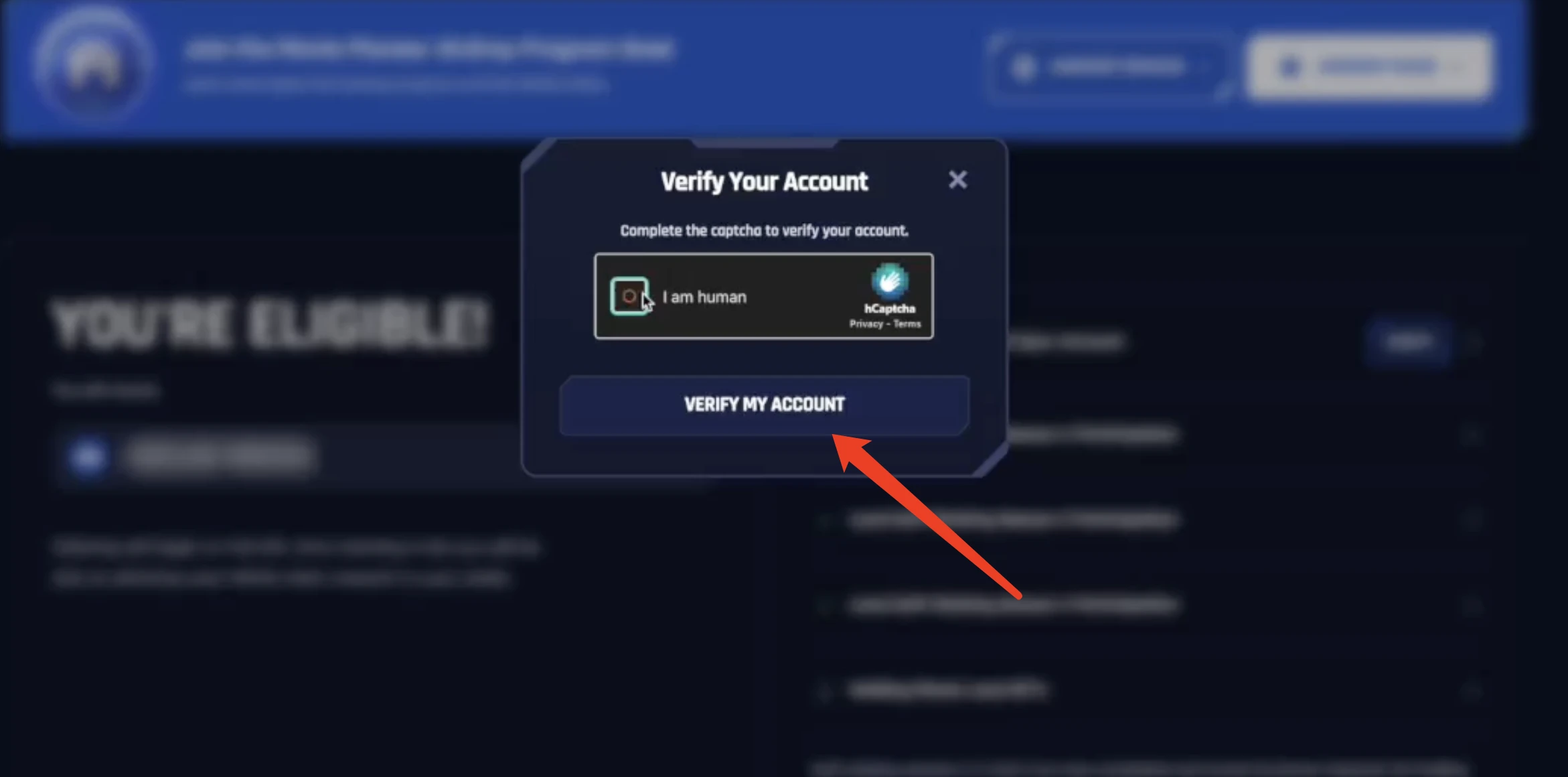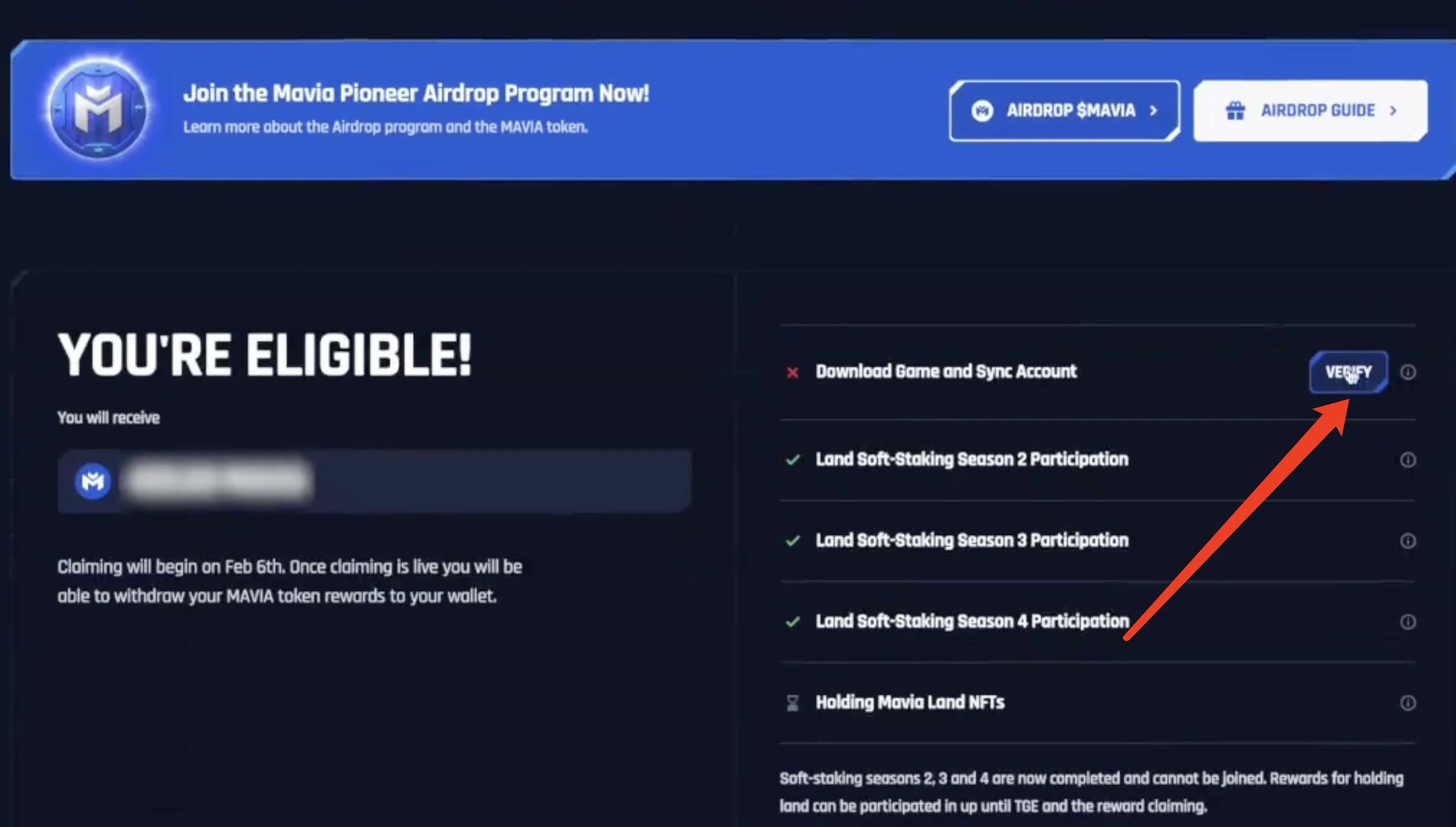 STEP 6. 在 Mavia Airdrop 页面上,点击“Verify”以确认帐户已正确同步。经过反机器人验证码后,如果同步成功,将看到一个弹出窗口,显示“Account Verified”!完成此步骤后,该账户的空投即被确认。
