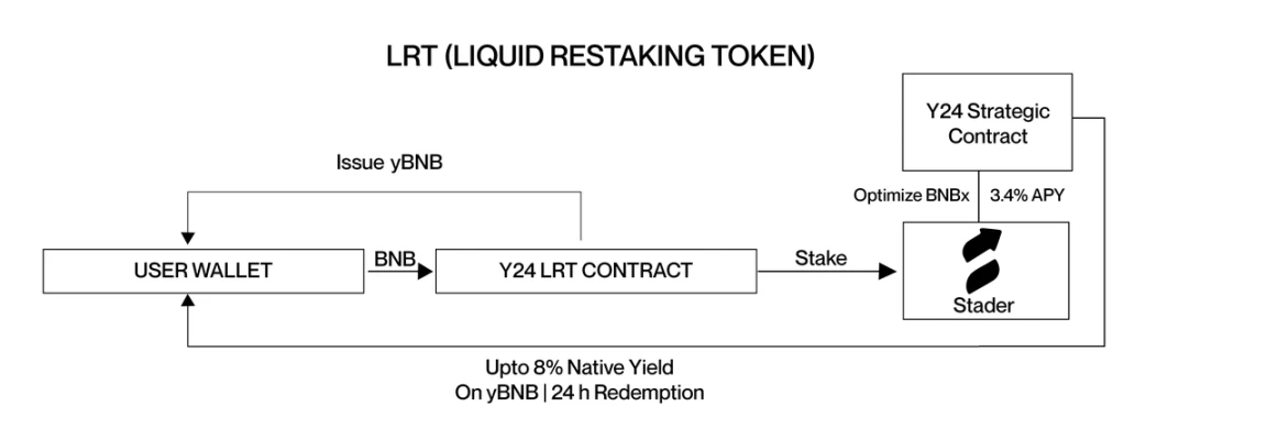 Yield 24 是一个在 BNB Chain、以太坊与 Polygon 等 EVM 相容链上执行的流动性再质押协议,使用者可在该协议中再质押其 ETH、BNB、BTC、稳定币或 LRT。目前,Yield 24 已在 BNB Chain 上整合 Stader、Ankr Liquidi Staking 这 2 个流动性质押平台与验证器,使用者可质押 BNB 以获取 yBNB,并赚取 Yield 24 原生代币 Y24 代币奖励。