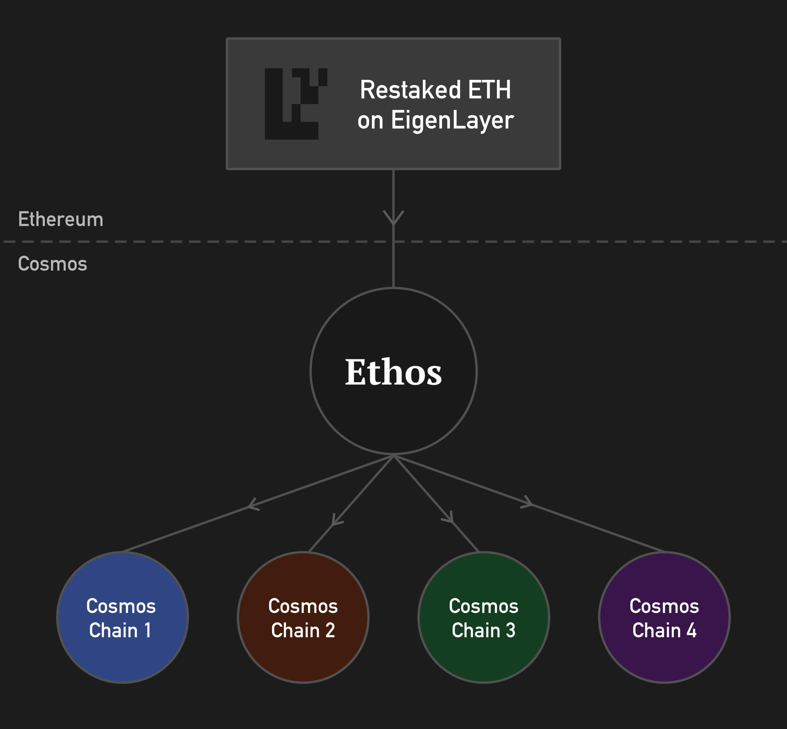 Ethos 旨在将以太坊再质押至 Cosmos,应用链可受益于以太坊经济安全。Ethos 采用 Mesh Security 共享安全解决方案,通过部署 AVS 来利用 EigenLayer 基础设施,并依靠 IBC 与 Ethos 应用链来协调消费者链之间的使用者权益。EigenLayer 再质押者将 ETH 存入以太坊 Layer1 上的 AVS,并选择一个节点运营商进行委讬。执行层节点运营商在每个 Cosmos 消费者链上都有一个预设的验证器来委讬其虚拟质押(virtual stake)。然后,Ethos 应用链通过 IBC 将更新的状态协调到各自的消费链,并处理后续的奖励和 / 或罚没更新。这些都会通过链下中继机制反应到以太坊 L1 的 AVS 合约上。