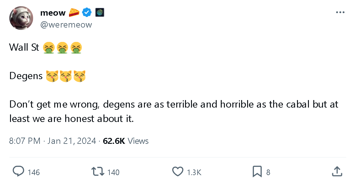 Meow: 而且我想说, 你也可以成为一个 Degen。 我不会说,任何一名 Degen 比华尔街更好,毕竟他们都一样。